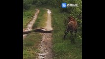 Un tigre croise la route d'un énorme python