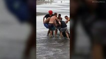 This sports car got stuck in the sand at the beach. Strangers came to help the driver by trying to push the car out.