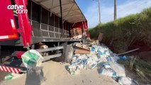 Carreta carregada com grãos tomba e interdita pista na rodovia PRc-467, próximo ao viaduto da Jacarezinho