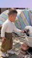 The pet dog was put into the pot by his little master to stew and eat, with a helpless expression
