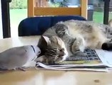 Un chat plein de patience, moi je l'aurais déjà bouffé cette tourterelle