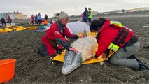 Rubber whales strewn across Aberystwyth beach