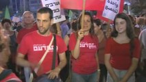 Israeli police tear down a sign reading "Stop the genocide in Gaza" held by a small group of demonstrators in Tel Aviv.