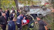 Tekirdağ'da kayganlaşan zeminde yoldan çıkan otomobil, beton bloğa çarparak paramparça olurken, motoru dışarı fırlayan araçtan 3 genç hafif yaralı çıkarıldı.