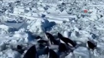 Japonya’nın Hokkaido eyaleti açıklarında 10 katil balina, sürüklenen buz kütlesine sıkıştı.
