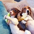 Deux mignons chiens en train de deguster la banane