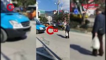 Yaşlı adam AKP’nin seçim arabasının önünde elindeki poşeti göstererek isyan etti