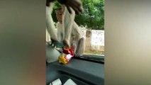 Des singes gourmands lèchent le parebrise pensant pouvoir attraper un paquet de biscuits