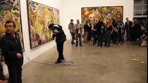 Jonathan Meese (born 1971 in Tokyo) grew up near Hamburg where he studied at the Hochschule für Bildende Künste. He lives and works in Berlin and Hamburg. With “Mama Johnny” he is now presenting his first extensive exhibition in his home town. At the center of the exhibition is an 8 meter high, 20 meter wide and 40 meter tall “Black Box” in which Meese installed the stage for the “Kokain” production at the Berliner Volksbühne. There’s also the installation “MOR”, a pink castle which Meese conceived with TAL R, the “Maldororturm”, and the “Parsival Head”. The exhibition includes collaborative works with Jörg Immendorff, Albert Oehlen and Daniel Richter. Opening reception at Deichtorhallen with play “Kokain” and after show party, Hamburg, Germany, April 27, 2006. Part 2/3.