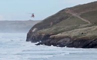 Dramatic footage shows the moment a dog walker was airlifted to safety - after falling into the sea.