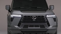 The 2024 GX introduces a noticeable change from the previous generation with a square-body profile with a horizontal design motif. From the front, the all-new GX continues the Lexus spindle body concept with an all-new bold, resolute design that also aids in off-roading functionality. To achieve the grounded, stable stance, designers created a taut body with a wide track and fender flares, pulling the front pillar base to the rear. The overall width increases by 95 mm (Overtrail by 115 mm) compared to the previous-generation GX. The Premium Triple Beam LED headlamps and grille opening have been raised to help avoid potential road impact. LED fog and cornering lamps are available for increased visibility. The front overhang has been decreased by 20 mm for improved clearance. The powerful front presence is led by the seamless grille and headlamp integration.