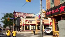 Shows a parade through bunting-draped streets, probably in the town of Leominster, Mass. | dG1fcWMyLXlKY2lVUGc