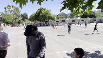 Kha kicking in kickball vs. teachers. After you score one run you're allowed to try for another one if you can make it to first base in time.