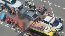 이후 반대 차로를 달리던 승합차가 이를 피하려고 중앙분리대와 충돌했고, 승용차 2대가 잇달아 추돌했습니다.