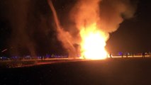 A breathtaking high-resolution photo of a monstrous tornado emerging on the horizon, casting an ominous shadow across the desolate landscape. The twisting funnel of the tornado, a swirling vortex of debris and wind, reaches towards the earth, creating a chaotic whirlwind that threatens to consume everything in its path. The sky is filled with dark, menacing clouds, and the wind howls as it whips through the barren field, leaving only a few swaying, battered crops standing in defiance of the storm. The image captures the raw, unbridled power of nature, evoking a sense of awe and trepidation.