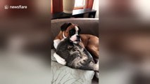 Boxer dog takes care of kitten