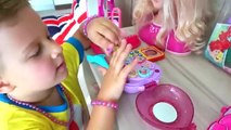 डायना और रोमा खिलौना सौंदर्य प्रसाधन के साथ खेल रहे हैं