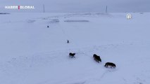 Karla kaplı arazide kurtlar sürü halinde görüntülendi
