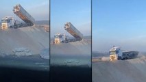Hafriyat kamyonunun damperi devrildi; Sürücü saniyelerle ölümden kurtuldu