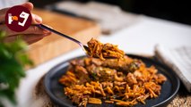 Fideos con solomillo de cerdo y setas