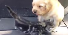 Kätzchen und Welpe werden beste Freunde
