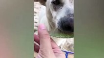 Perrito callejero pidió comida con una hoja como si quisiera pagar.