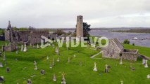 Smooth aerial pan of Clonmacnoise,,cathedral, round towers and high crosses