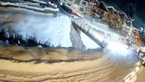 A dramatic scene unfolded in Val Gardena, Italy, when an avalanche crashed against the mountain's surface, engulfing skiers and chair lifts in a cloud of snow. Fortunately, no one was hurt, as the snow transformed into powder by the time it reached the people below.