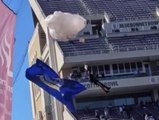 Vor einem Rugby-Match in Frankreich ist ein Fallschirmspringer am Stadiondach hängengeblieben. Die Feuerwehr konnte ihn unter dem Jubel der Zuschauer befreien.
