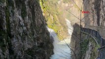 Bartın'ın Ulus ilçesinde, 'aşk acısını dindiren şelale' olarak ünlenen Ulukaya kanyonu ve şelalesi, nisan ayında kar yağışıyla birlikte seyrine doyumsuz bir güzelliği büründü. Eşsiz güzellik havadan dron ile görüntülendi.
