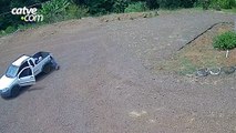 As imagens mostram um Fiat Uno prata fazendo a rotatória em baixa velocidade, quando a porta do passageiro abre e a criança cai no asfalto
