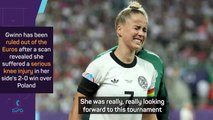 Sortie sur blessure en première période contre la Pologne pour l'entrée en lice de l'Allemagne à l'Euro (2-0), la capitaine Giulia Gwinn souffre du ligament médial du genou gauche. La Fédération allemande de football a annoncé son forfait pour le reste de la compétition. Sa coéquipière Sarai Linder estime que l'absence de sa capitaine sera difficile à surmonter, mais que Gwinn sera toujours proche du groupe.