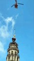 Il était perché en haut de son beffroi depuis plus de 100 ans. Il fallait donc venir le voir au plus près. "C’est un évènement quand même assez important car cela fait de nombreuses années que le lion n’est pas descendu sur la place d’Arras", se réjouit un habitant de la ville venu assister au spectacle. Une heure plus tôt, ce fameux lion en or, symbole d’Arras et de la région, est solidement harnaché à un hélicoptère. Il s’apprête à descendre pour la première fois pour être restauré. Perchés à 75 mètres de haut, des techniciens sont chargés de le déplacer en lui sciant les pieds. Après quoi, le lion a pu s’envoler.
