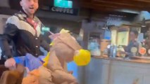 These friends were out having fun when the guy on the right decided to pull a prank. He helped his friend wrap around a pole, holding his legs up so his hands were trapped underneath. But as soon as the friend clung to the pole, he stepped away, leaving him stuck and unable to get down.