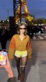 Hailey Bieber sort de son hôtel pour se rendre au défilé YSL