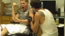 Ce jeune homme est en train de se faire tatouer. Mais il ne se doutait pas que cela serait aussi douloureux