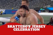 Giants' Cam Skattebo strips off shirt with Ryan Fitzpatrick in BONKERS postgame scene