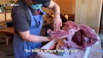 In this video, Food & Wine Best New Chef Jordan Rubin shows off his incredible knife skills as he breaks down an entire 375-pound wild Maine bluefin tuna. Watch as he explains every prized cut, from the fatty otoro belly and kama (collar) to the lean akami.