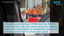 A heated confrontation between CFMEU and Australian Workers Union members has been shown during an ongoing inquiry that heard claims of intimidation, abuse and turf wars across Queensland’s construction sector.