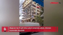 İstanbul Bağcılar'da kentsel dönüşüm kapsamında 8 katlı binanın yıkımına karar verildi. Binanın kolonlarını kıran yıkım ekibi, binadan uzaklaşarak iş makinesiyle yere vurup binayı yıkmaya çalıştı. Binaya çok yakın bir noktada bulunan tankerin üstünde oturarak yıkımı izleyen 1 kişi ise ölümün kıyısından döndü.