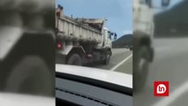Criança pega 'rabeira' em caminhão, cai e quase é atropelada; vídeo