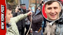 Far-right influencer Jake Lang dodges protesters while parading a goat around Manhattan