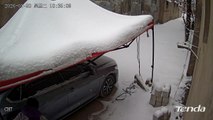 Elderly woman accidentally punctures car tent roof while removing snow in Henan, China