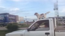 Un chien se promène sur le toit d'une voiture en Thaïlande