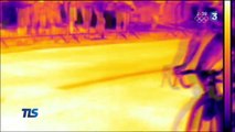 Caisson flashover, Camps de Canjuers (France). Stage formateur flashover en Septembre 2009. Effets des impulsions, vues avec une caméra thermique Bullard. Lance POK Debikador, réglée à 150lpm. Stage organisé par PCSF (Protection Civile Sans Frontière).