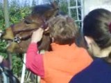 Un cheval prend le bras d'un cycliste pour un mors