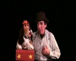 Ventriloquist Andre Astor on stage with his "live" talking dog Ventriloque Andre Astor sur scène avec son chien Oscar