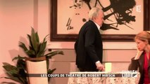 Théâtre des Bouffes Parisiens : interview de Robert HIRSCH (assis fumant devant la scène des Bouffes Parisiens) sur les causes de son départ de la Comédie Française et les raisons de son choix de la pièce d'Yves JAMIAQUE "Monsieur Amilcar" qu'il va créer, mise en scène par Jacques CHARON. Extraits de la pièce avec Robert HIRSCH et Judith MAGRE.