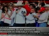 Tras dos años de exilio debido a un golpe de Estado en su contra, el ex presidente hondureño Manuel Zelaya regresó a Tegucigalpa, donde se reencontró con sus seguidores en un masivo acto. Zelaya destacó la lucha de la resistencia del país y agradeció la mediación de Colombia y Venezuela para gestionar su retorno. teleSUR