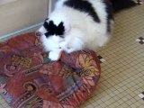 Féline chatte angora, fait sa folle avec un coussin